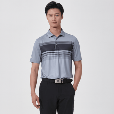 Elevate your game with the Onward men's polo, designed for avid golfers. This shirt features UPF50+ protection and moisture-wicking technology to keep you dry and shielded on sunny days. Its anti-bacterial properties ensure lasting freshness during play. The stylish stripe print across the front chest and a neat self-fabric collar with a built-in collar stay enhance its sophisticated and classic appearance. Tailored with a high-low hem and side slits for greater mobility, this polo is made from 92% recycled polyester and 8% spandex, blending eco-conscious fashion with functional design.