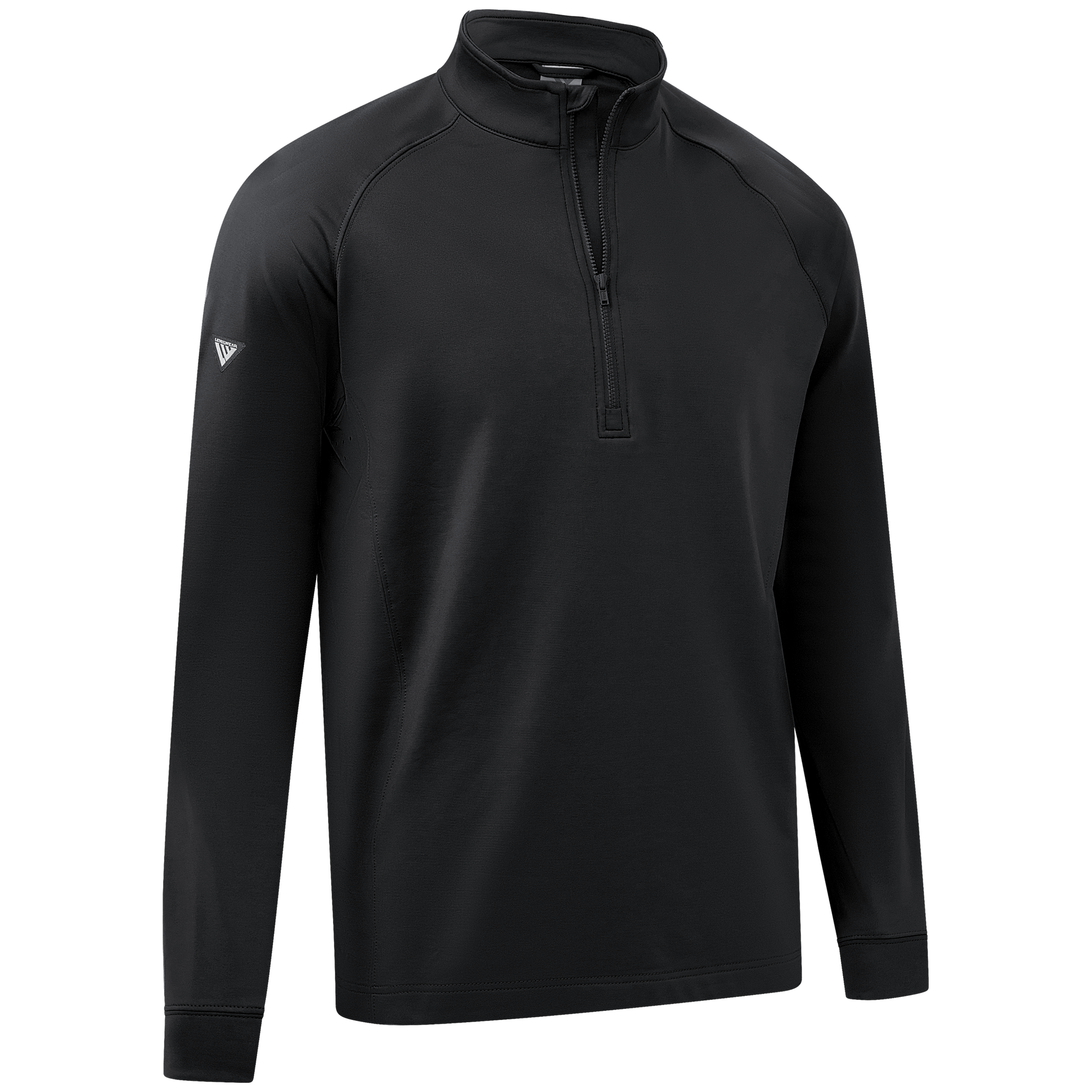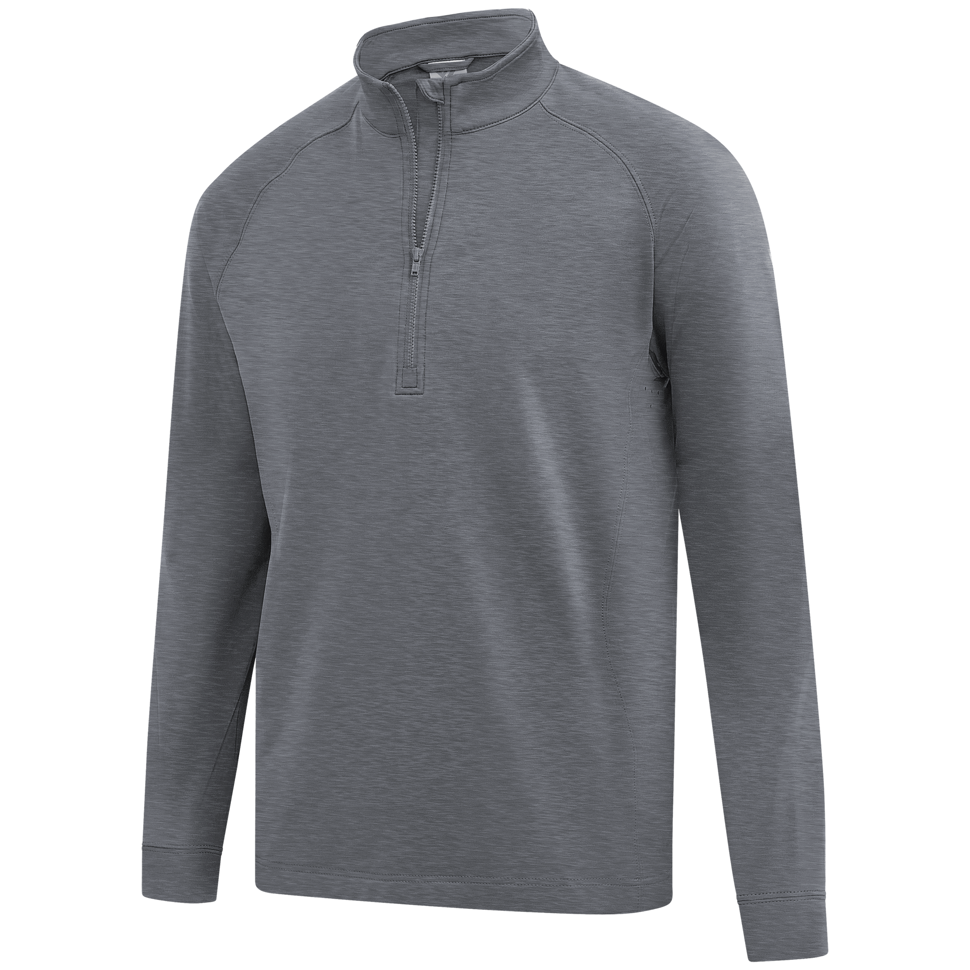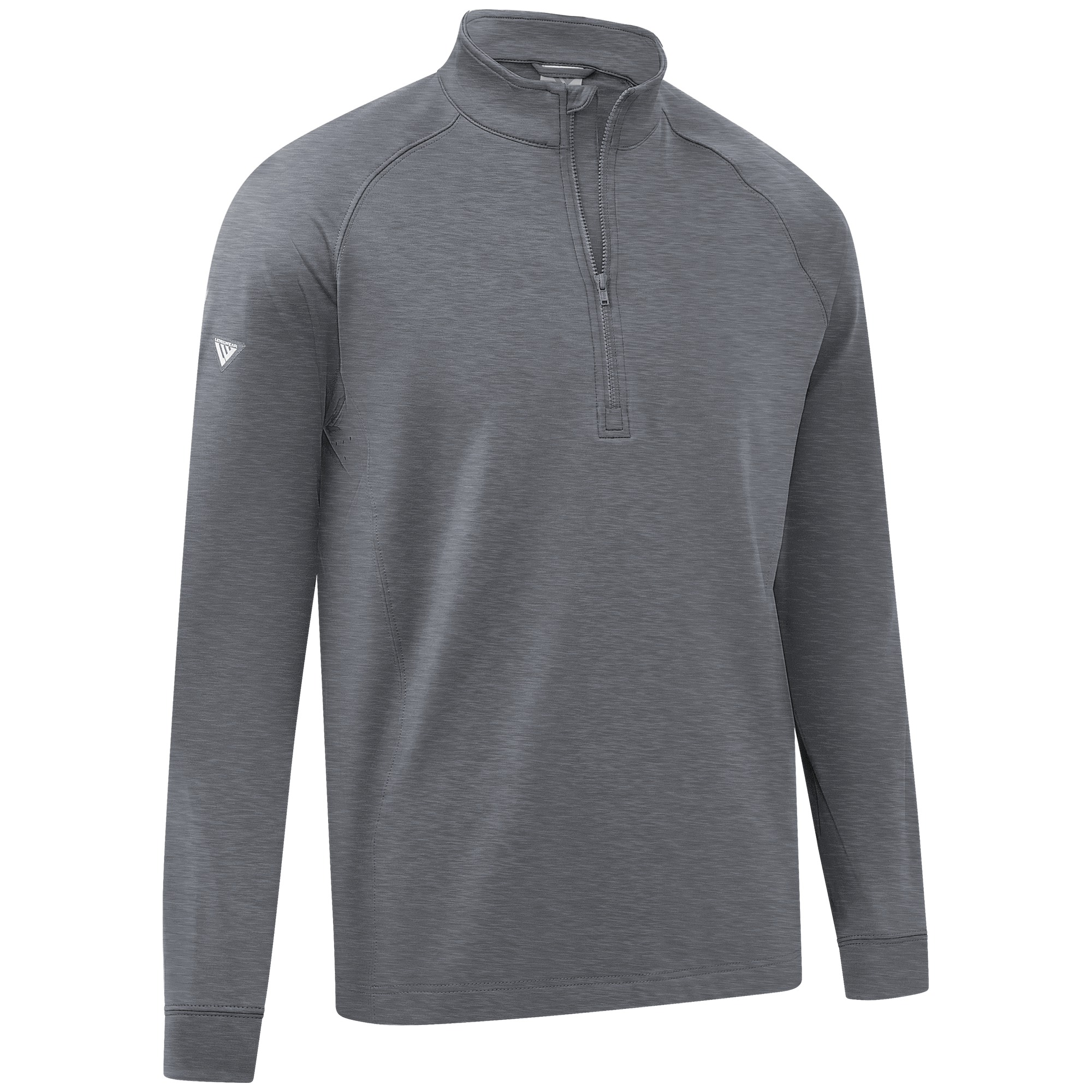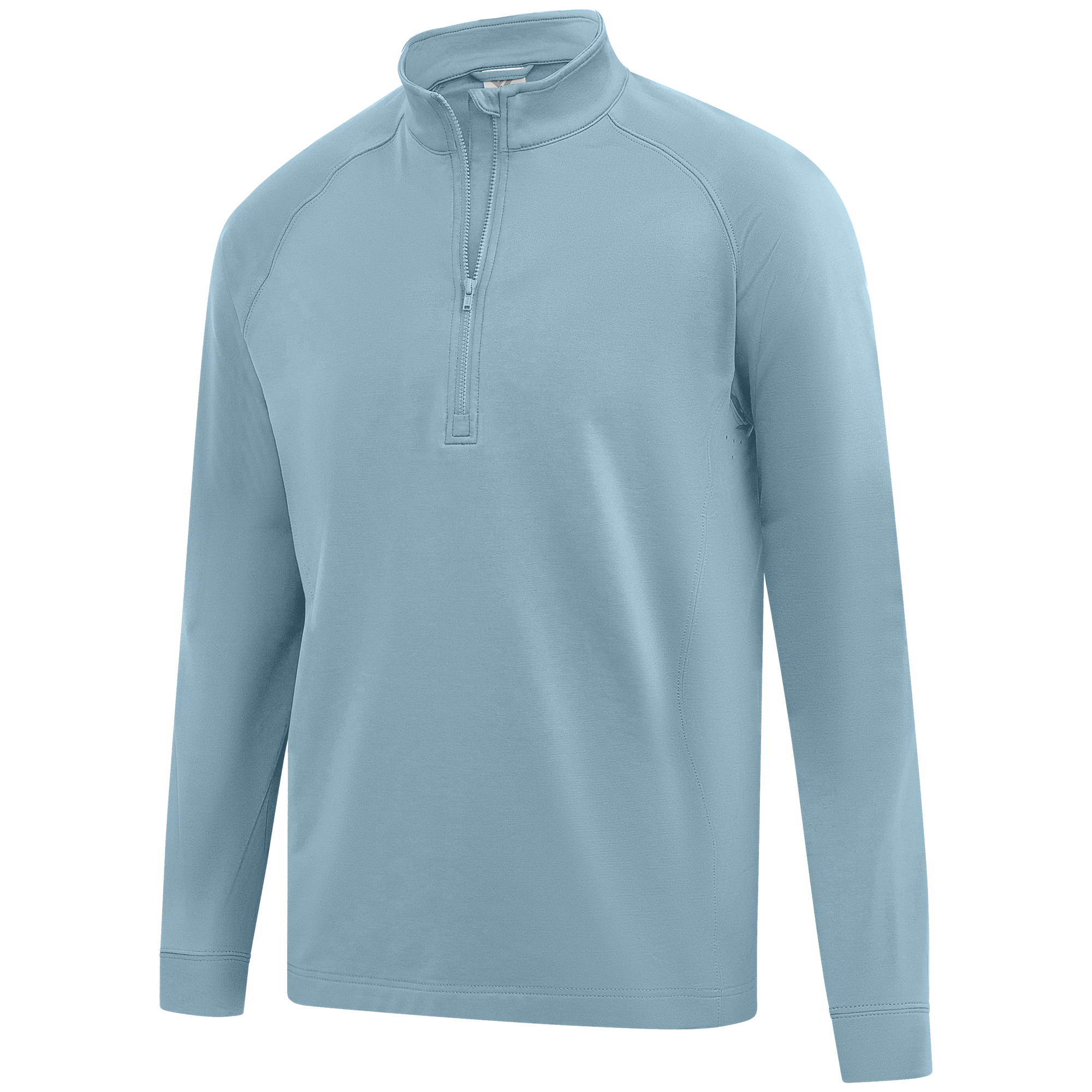 Experience the unexpected warmth of the Calibre mid-layer, a men's mid-weight quarter-zip pullover that combines enhanced functionality with refined simplicity. This garment features a mock neck topped with a durable vislon zipper and is crafted with raglan sleeves to facilitate unrestricted movement. The interior is brushed for a supremely comfortable feel. It is tailored with banded cuffs for a snug fit, engineered side panels for a streamlined look, and underarm perforated venting holes for optimal breathability, ensuring that it keeps you warm without sacrificing comfort or mobility.